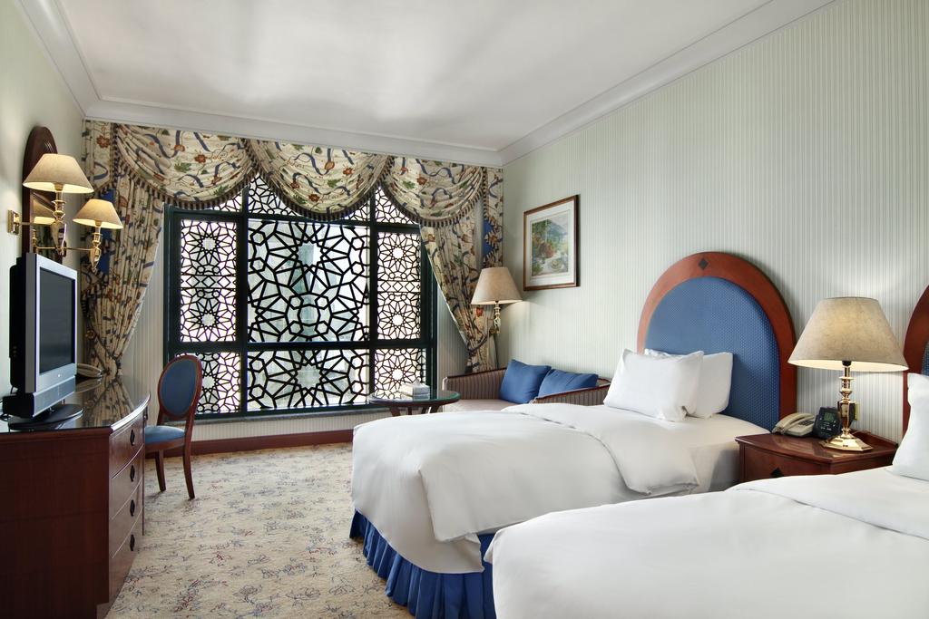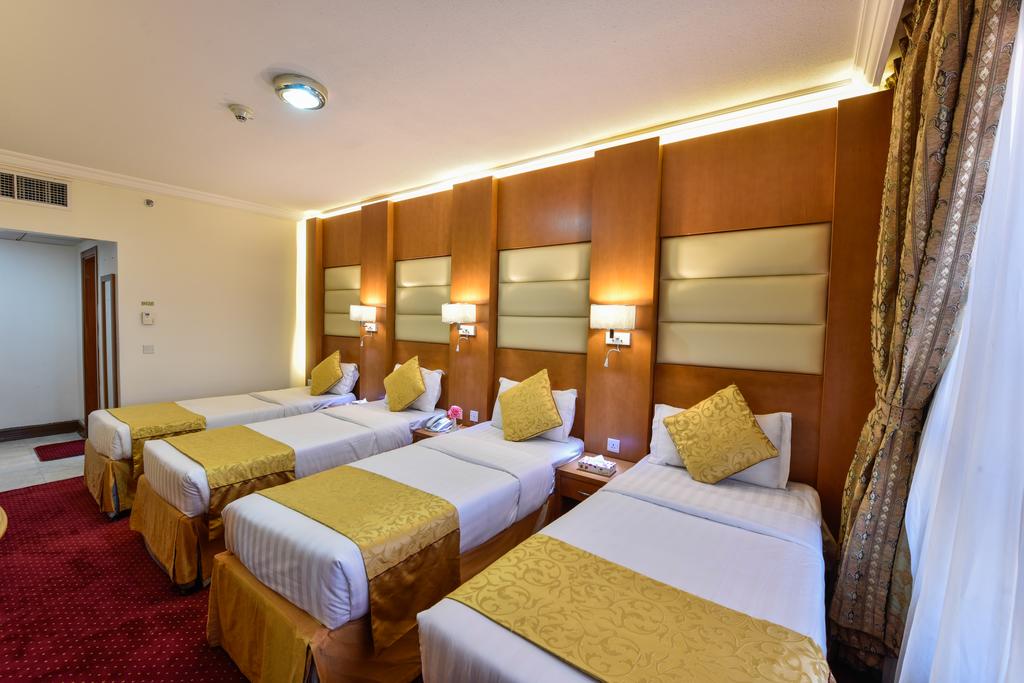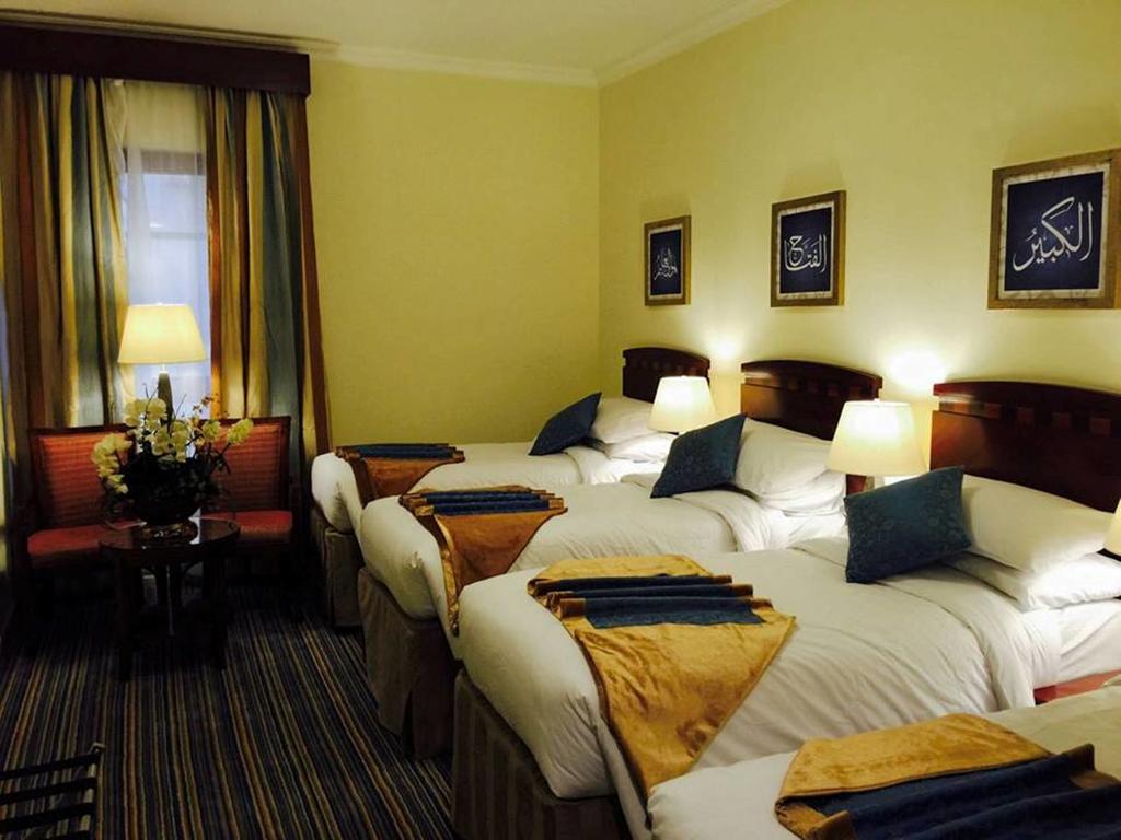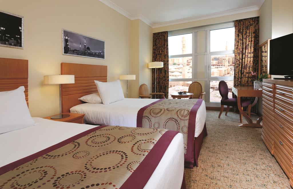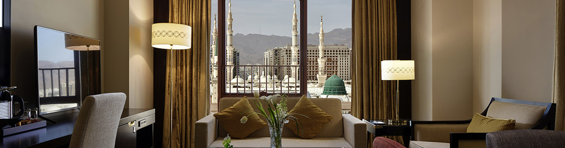 This hotel overlooks the Haram of Masjid al-Nabawi, so pilgrims can walk or take a free shuttle directly to the male and female entrances of the Prophet's Holy Mosque.